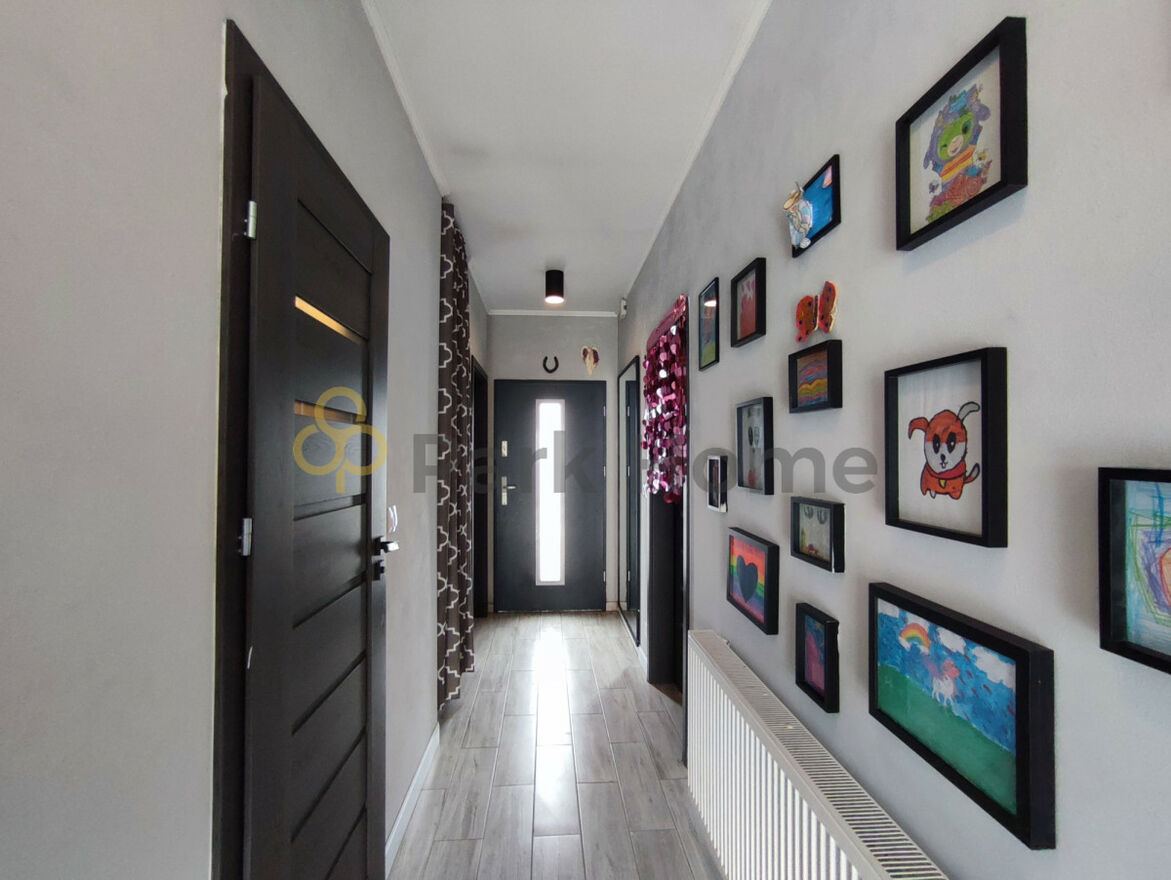 W korytarzu mamy miejsce na szafę wnękową oraz wejście do kotłowni . Dalej - salon podzielony na dwie strefy - wypoczynkową z wygodnymi fotelami, stolikiem i rtv. Druga część stanowi aneks kuchenny.